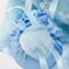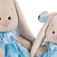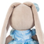 Торжественное бархатное платье цвета голубой гортензии со сборочками на лифе и прозрачным бантиком. Платье дополняют необычная верхняя юбочка из тонкой голубой органзы в цветочек и рукавчики-крылышки из такой же ткани. Украшение на ушке будто бы нераскрывшийся цветок из ткани плотного голубого цвета. В лапках у Зайки атласная сумочка с цветком из сеточки и голубыми атласными лентами.