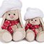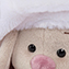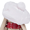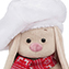 Зайка Ми в объёмном белоснежном берете из сверкающего меха с помпоном. Также на Зайке оригинальный шарфик из красного с принтом и серебристым люрексом трикотажа.