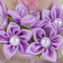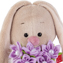 У Зайки в лапках нежный букетик лиловых цветов из шелковистого сатина. В серединке каждого цветка белая жемчужина. Букетик обёрнут в беленькую сеточку.